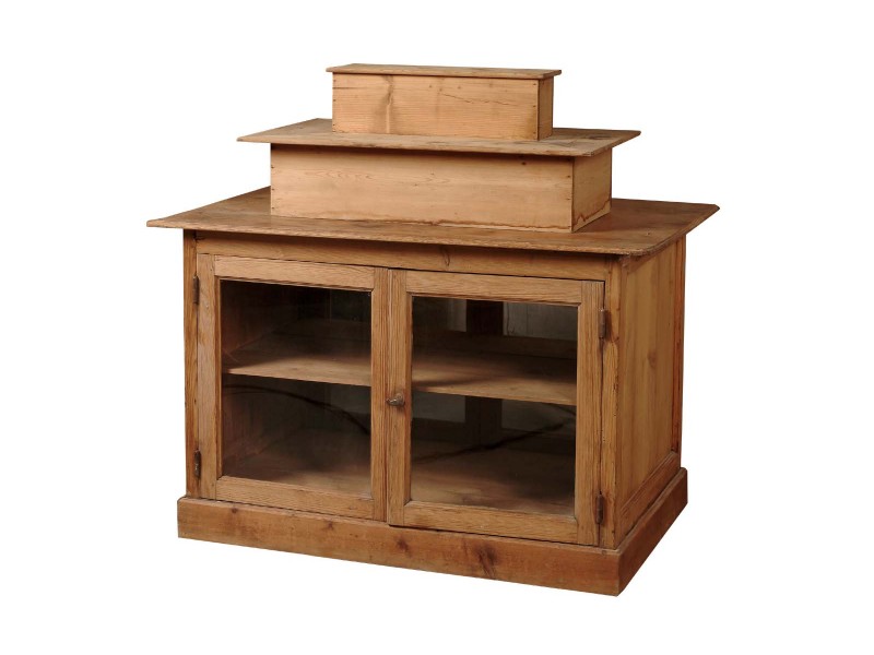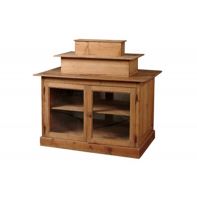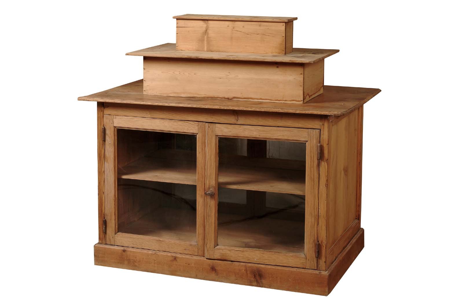 Vers 1910 - 1915, meuble de présentation en sapin comportant une vitrine en partie basse et un gradin à deux niveaux en partie haute.